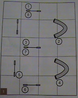 She had a LOVELY run. I think my scanner cut off the bottom, but the rules were that you had to start at one of the start/finish runs and finish at the opposite. We started at the bottom and did 1-6, 1-5, a REALLY CLOSE call-off at jump 4 (phew!), 1-5 and then got to six when she knocked a bar. That's 33 points and apparently that's not enough to qualify. I don't know what you need -- 38 rings a bell? Bummer.